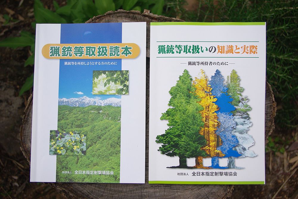 左、初心者が受ける猟銃等講習会(初心者講習)で使われるテキスト。右、更新のため受ける際に使われるテキスト。考査が行われるのは初心者講習だけです。