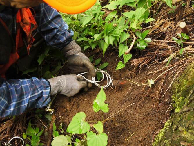 くくりわなのワイヤーの長さから、獣が動ける範囲を把握し、安全に接近できる場所を確認します。