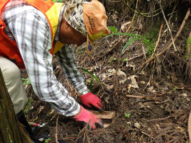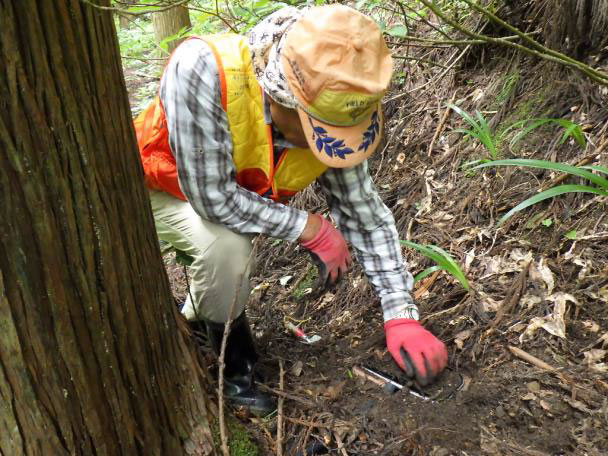 くくりわなは、獣が頻繁に出没している場所に設置します。シカの足跡やフンなどの痕跡(フィールドサイン)を探し、頻繁に利用している場所を見つけます。
