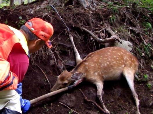 保定した獣には、斜面の上側から近づき、できる限り不要な苦痛を与えない方法で止め刺します。