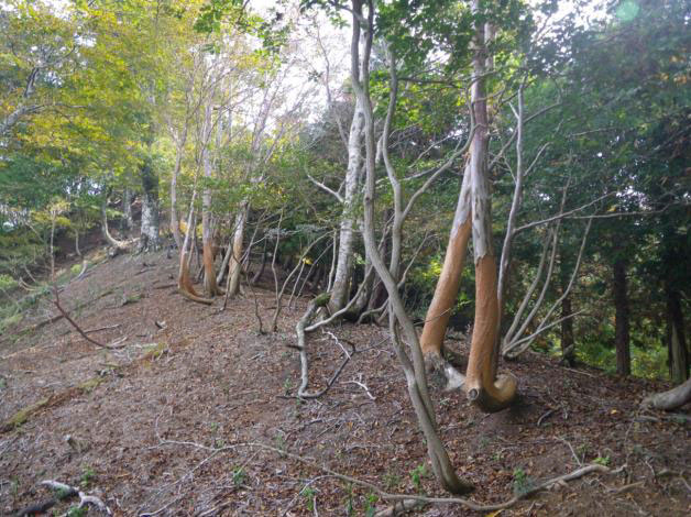 - くくりわなには、斜面上部から近づきま