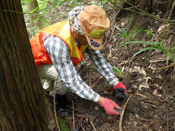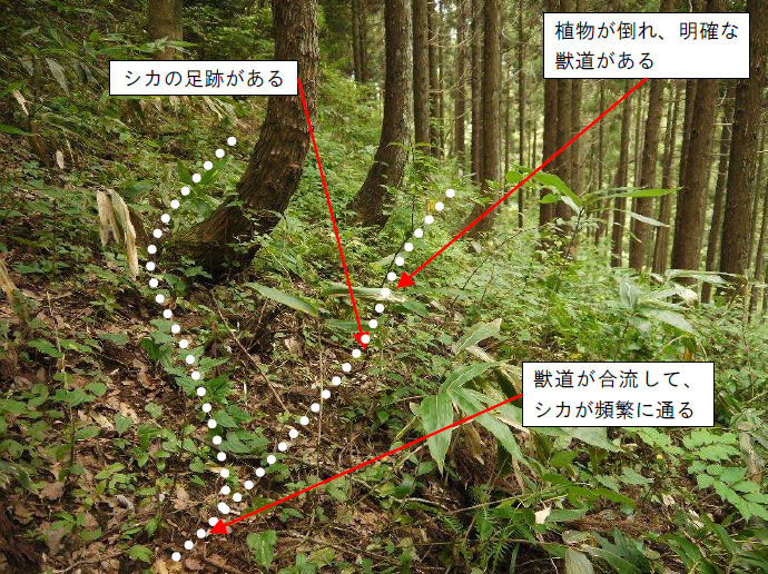 くくりわな設置後に、シカに警戒されないよう、獣道は踏み荒らさない