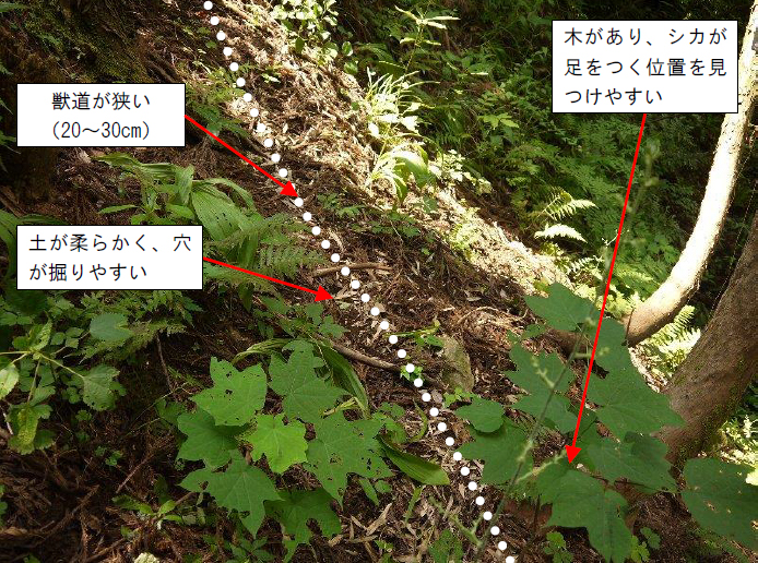 - 獣道が狭いなど、くくりわなを設置する位置が決めやすい場所