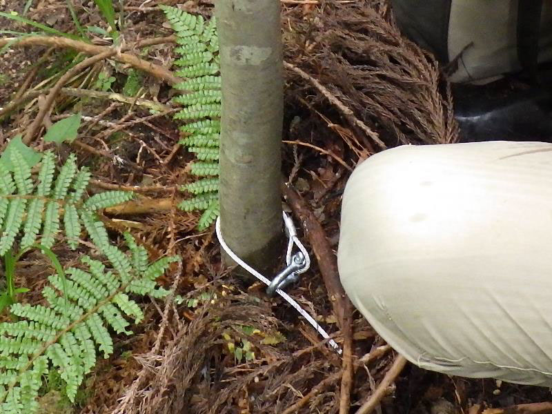 保定用補助具のワイヤーをシカの首や足、角にかけ、くくりわなを固定(根付け)した木と反対側の木に保定用補助具のロープを結ぶ。