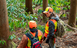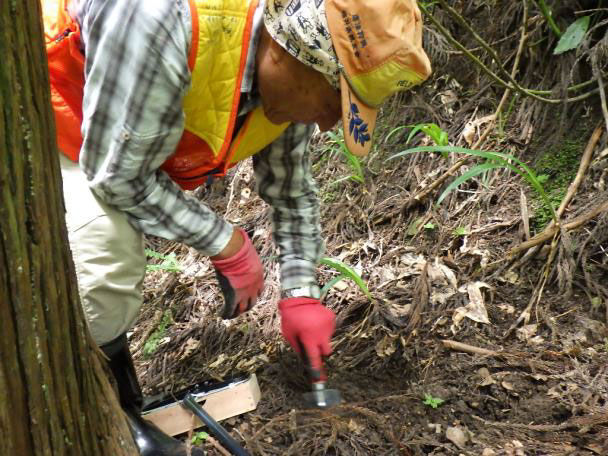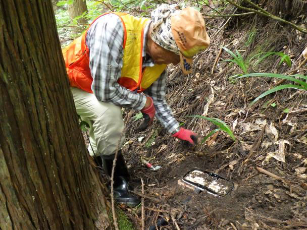 くくりわなは、獣が頻繁に出没している場所に設置します。シカの足跡やフンなどの痕跡(フィールドサイン)を探し、頻繁に利用している場所を見つけます。