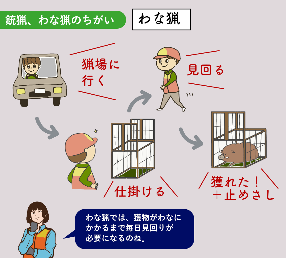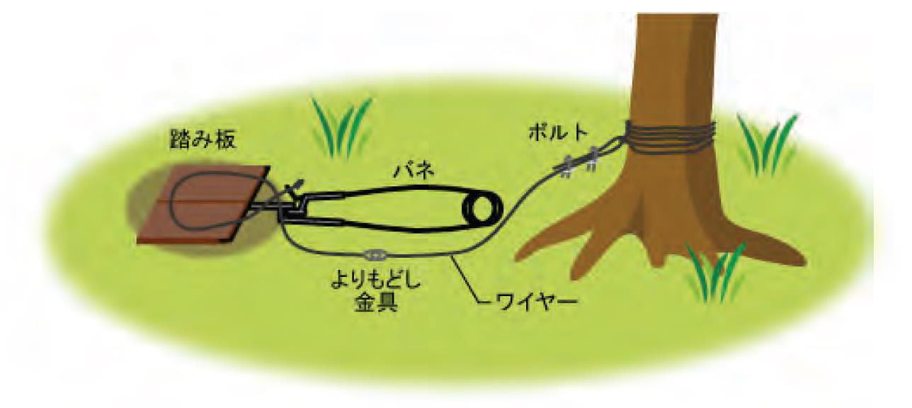 ※獲物は、くくりわなにかかった後、時間が経つほどに暴れます。すると、わなが壊れたり、足が抜けるなどの危険が生じます