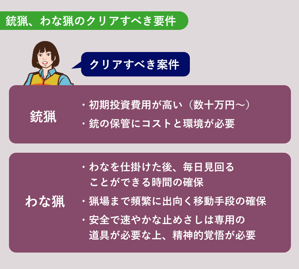 - オスジカなど体格が大きく、接近することが危険な場合:銃