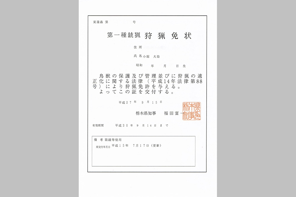 第一種銃猟狩猟免状。