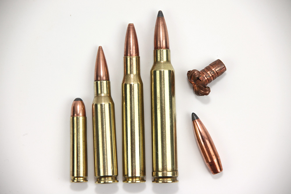 各種ライフル実包。先端の弾頭部分のみが発射されます。右上は獲物に命中した弾頭で、つぶれることで威力が増す仕組みになっています。