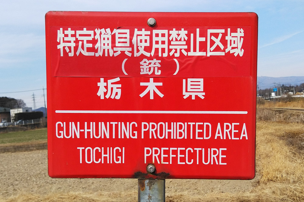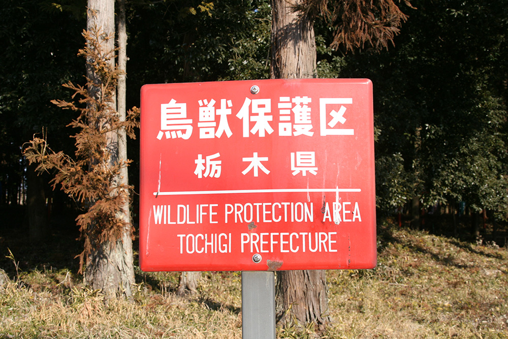 鳥獣保護区の看板。銃だけではなく、わなや網といった他の法定猟具も使用できません。