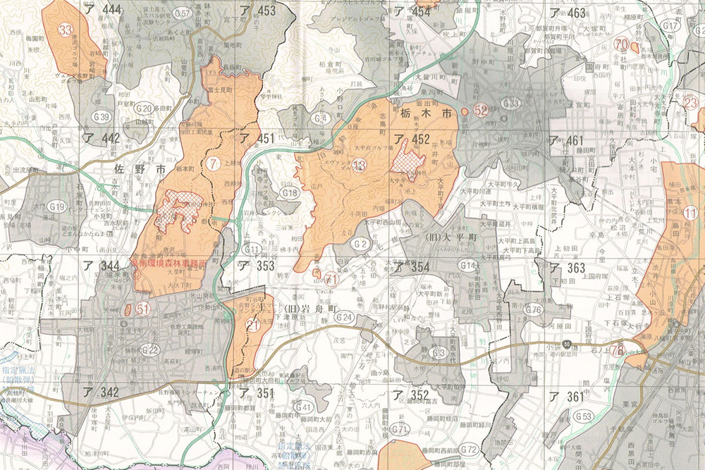 鳥獣保護区等位置図(ハンターマップ)はいくつかに色分けされており、暗色で塗られた場所は特定猟具使用禁止区域(銃)、赤い場所は鳥獣保護区です。