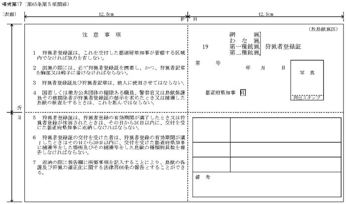 従来から行われてきたこの狩猟は、有害鳥獣捕獲等と区別するため、「登録狩猟」と呼ばれています。 この狩猟者登録は、それぞれの都道府県担当課に都道府県の収入印紙を貼付した申請書の提出が必要であり、猟友会の会員の場合には、この手続きを所属する猟友会が代行して行っています。