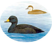 全長は約50cmで、胴体はカラスよりやや小さい中型のカモ。雌雄異色・オス大。オスは全体が黒色で、くちばしも黒いが、付け根の上面に鮮やかな黄色のコプが目立つ。メスは地味な色調で、全体がほぼ暗褐色だが、ほおから首の前にかけては汚白色。